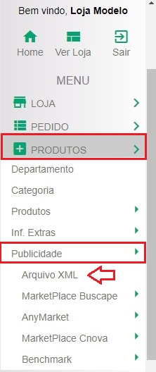 4 - Acesse o painel gerenciador de sua loja (www.lojasvirtuais-br.com.br/adm), vá em "PRODUTOS > PUBLICIDADE > ARQUIVO XML", conforme imagem abaixo: