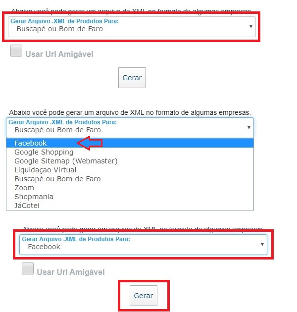 5 - Na tela que abrir, desça até o final no campo "Gerar Arquivo .XML de Produtos Para:", selecione a opção desejada (Facebook, Google...Etc), marque a opção "USAR URL AMIGÁVEL" e depois clique no botão "GERAR". Veja imagem abaixo: