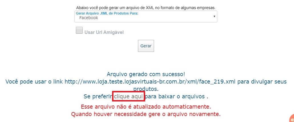 6 - Pronto! Arquivo gerado com sucesso. Você pode copiar a URL (dependerá da finalidade de uso do XML) ou fazer o download do arquivo. Para fazer o download do seu arquivo, pressione com o botão do mouse em "CLIQUE AQUI". Observação: Se deseja gerar o catálogo de produtos para usar no Facebook, deve fazer o download do arquivo.