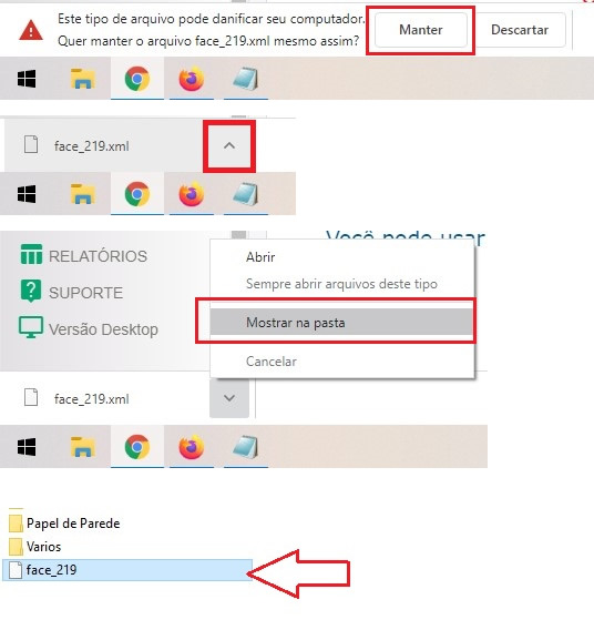 7 - No rodapé de seu navegador (Google Chrome ou Mozilla), pode aparecer uma mensagem perguntando se deseja realizar o download do arquivo, clique no botão "MANTER". Após finalizar o download, clique no botão com uma seta para cima, e em seguida na opção "MOSTRAR NA PASTA", vai abrir a pasta onde foi salvo o seu arquivo. Veja imagem abaixo: