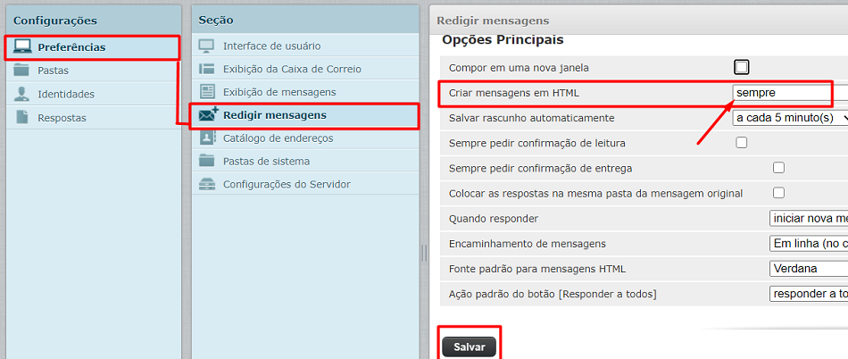 3 - Acesse o menu "Preferências > Redigir mensagens", na opção "Criar mensagens em HTML" selecione "SEMPRE" e clique em "SALVAR".