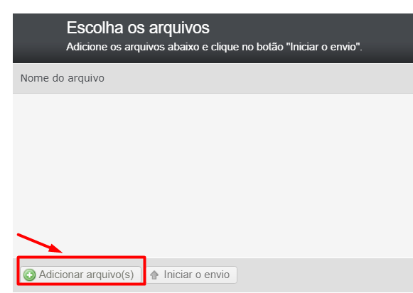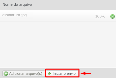 5 - Clique no ícone , após clique em "Adicionar Arquivo", selecione a imagem que deseja inserir na assinatura e depois clique em "INICIAR ENVIO", aguarde até que o envio esteja em 100%.