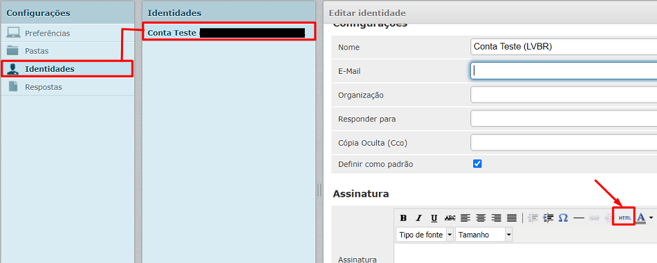 8 - Depois copie TODA a tag HTML já formatada com a URL de sua imagem, acesse novamente o seu e-mail, clique no ícone de configurações (), vá no menu "Identidades", clique na conta que deseja inserir a assinatura, no campo de assinatura clique no botão "HTML".