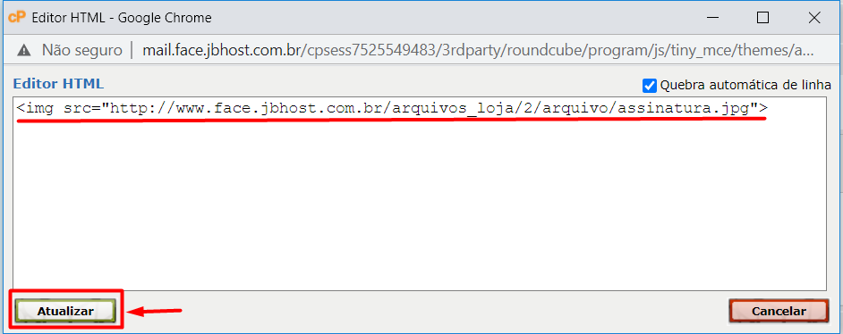 9- Abrirá uma janela para inserir códigos HTML, cole a tag HTML de sua imagem conforme exemplo abaixo. Lembrando que você deve inserir a URL de sua imagem dentro das aspas. Após inserir a tag, clique em "Atualizar". Pronto! Feito isso a imagem será exibida na assinatura de seus e-mails.