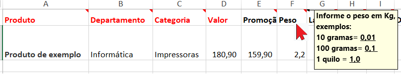 Ao passar o cursor do mouse nas colunas da planilha você consegue ver os comentários com instruções para preenchimento, conforme exemplo abaixo: