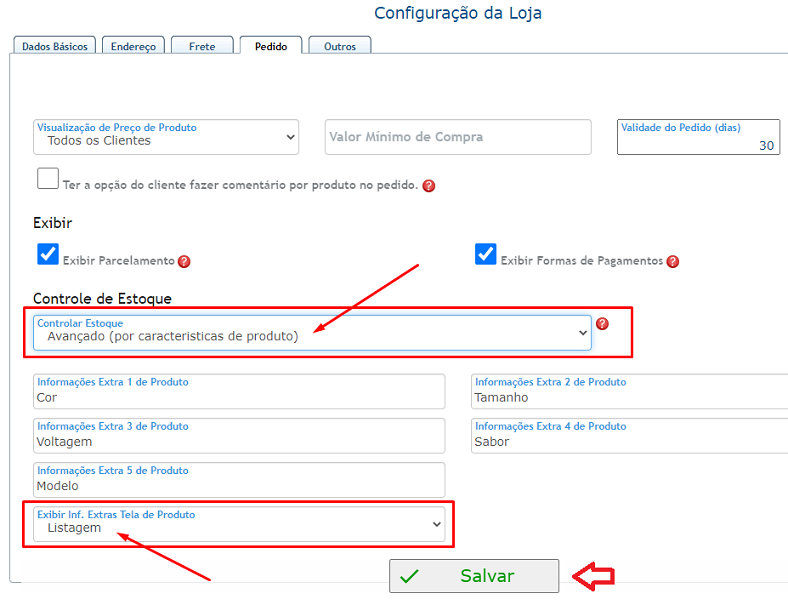 2 - Após clique na aba "PEDIDO". No campo "Controlar Estoque" selecione a opção "Avançado (por caracteristicas de produto)" e no campo "Exibir Inf. Extras Tela de Produto" selecione a opção "Listagem", assim as variações também serão exibidas na página dos produtos e não apenas quando o cliente incluir esses no carrinho de compra.: