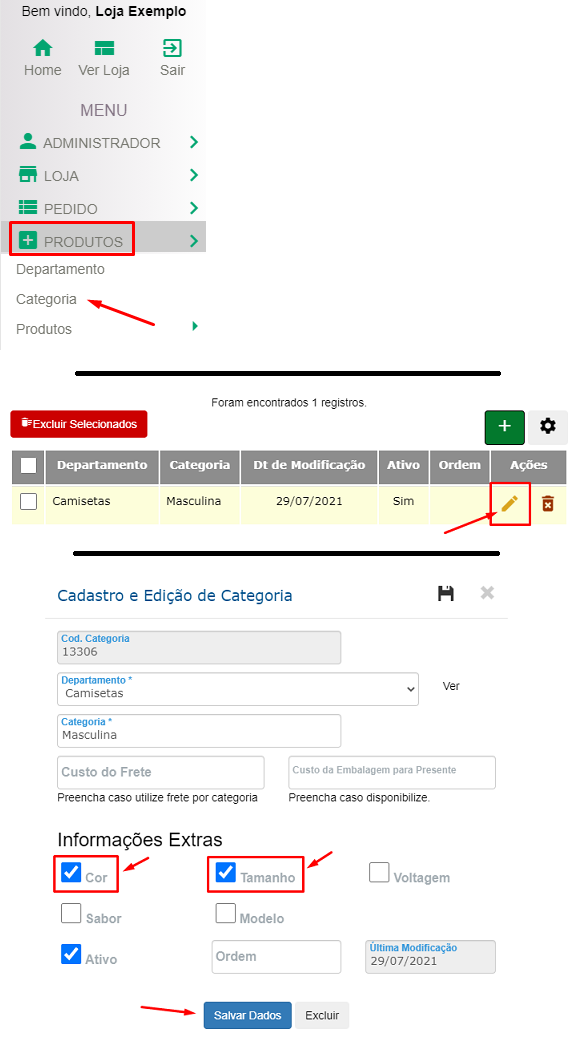 3 - Acesse o menu "PRODUTOS>CATEGORIA" e clique no botão "Editar" (indicado pelo ícone de um lápis) ao lado da categoria que deseja alterar. Na nova janela que vai abrir, selecione as informações extras que se aplicarão à cada categoria e após clique no botão "Salvar Dados". Nesse exemplo utilizaremos as variações "Cor" e "Tamanho" para a categoria "Masculina":