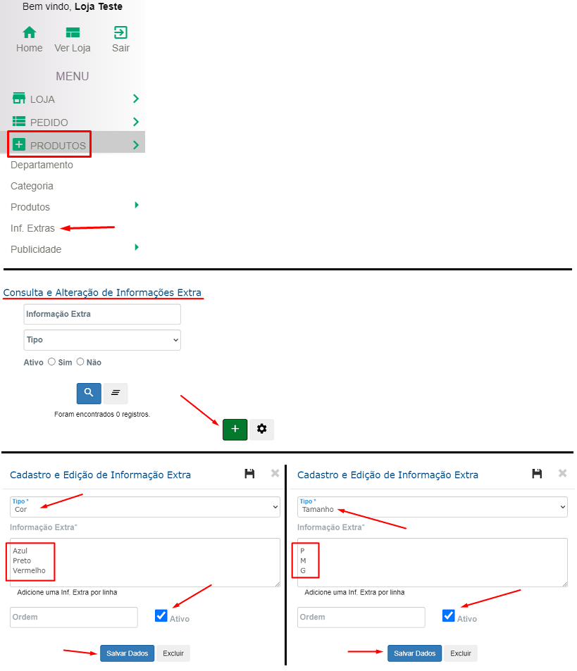 4 - Agora será necessário cadastrar a grade de variações, ou seja, a lista de cores, tamanhos e etc... Acesse o menu "PRODUTOS>INF. EXTRAS", clique no botão + para cadastrar as variações do seu produto. Na nova janela que vai abrir selecione o "Tipo" (Cor, Tamanho e etc...) e escreva a lista de variações (você deve inserir um nome por linha), marque a opção "Ativo" e após clique no botão "Salvar Dados":