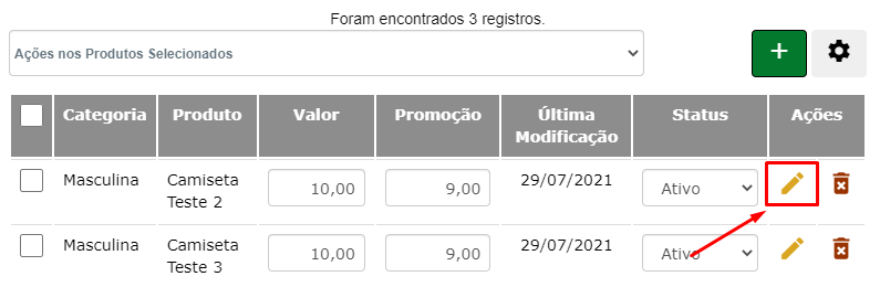 5 - Agora vamos configurar o estoque, valores e variações dentro dos produtos. Acesse o menu "PRODUTOS>PRODUTOS>CADASTRAR/CONSULTAR/ALTERAR", clique no ícone de lápis ao lado do produto que deseja alterar: