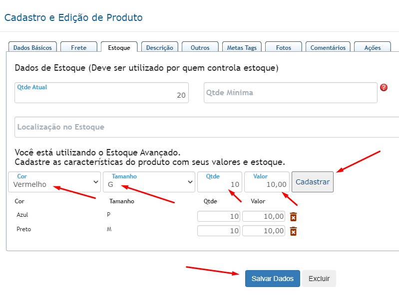 6 - Na nova janela que vai abrir, clique na aba "Estoque", no campo "Cor" selecione a variação de cor, no campo "Tamanho" selecione a variação de tamanho, no campo "Qtde" informe a quantidade em estoque dessa variação, no campo "Valor" informe o valor da variação desse produto e após clique no botão "Cadastrar" para cadastrar a variação desejada: