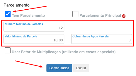 3 - Se desejar exibir para seus clientes as opções de parcelamento, marque a opção "TEM PARCELAMENTO", informe os dados abaixo e após clique no botão "Salvar Dados"
